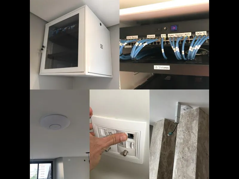 Neste projeto foi preparada a infraestrutura completa de cabeamento estruturado (pontos físicos de rede em todos os ambientes da residência) ponta a ponta (desde o switch Gigabit até os módulos de tomada RJ45 com validação dos pontos), repetidores wi-fi aéreos, pontos HDMI para os projetores e cabos de som alta-performance para todos os ambientes.