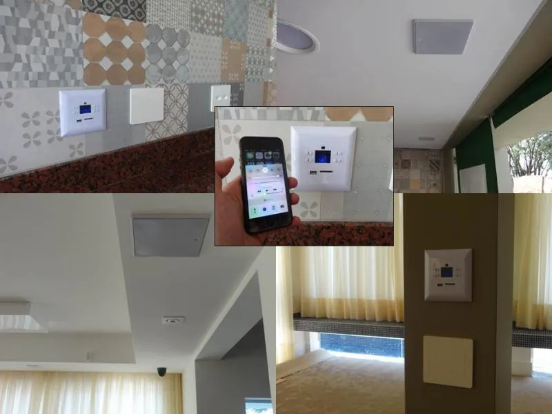 Nesta casa foram implantados 02 sistemas compactos de som ambiente 2.0 estéreo 01 zona com caixas embutidas no teto de gesso: 01 no Living e outro na churrasqueira. Fácil manuseio e instalação (caixa 4x4)