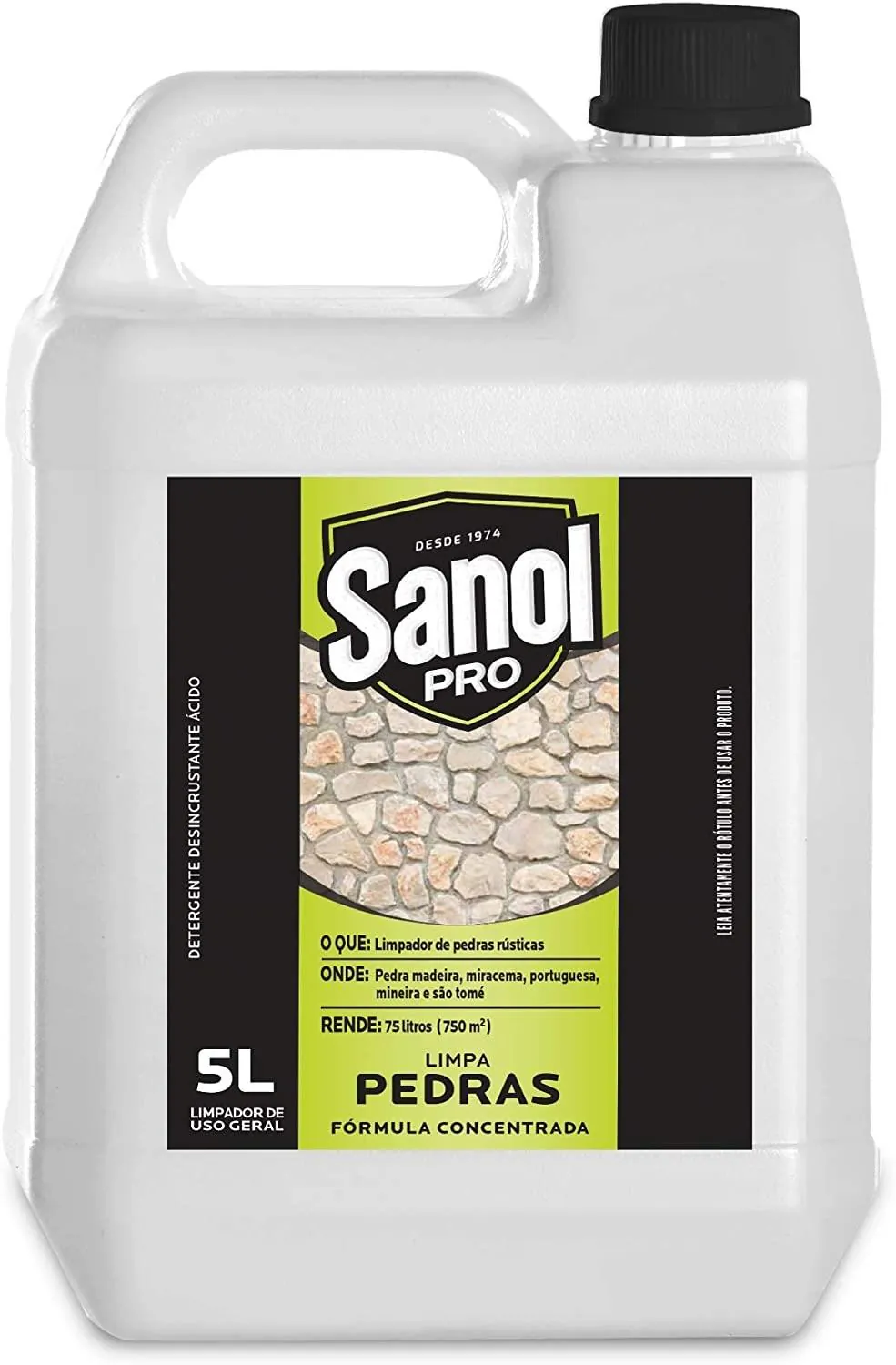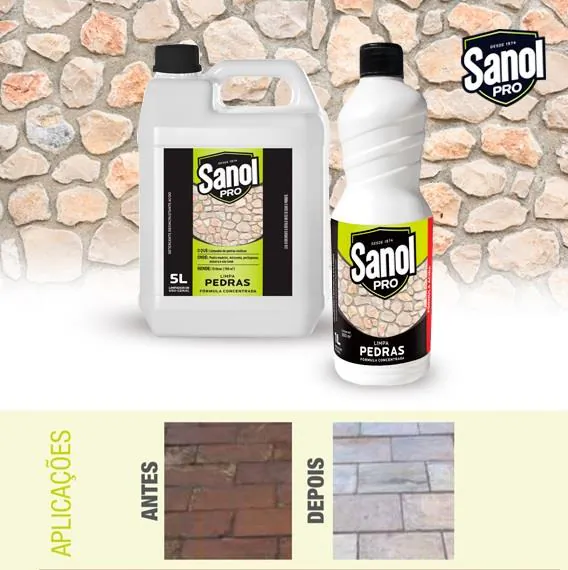 Limpa Pedras Sanol Pró tem alto poder de limpeza em Pedras Rústicas que possuam sujeiras dos mais diversos tipos, tais como: crostas de lama, encardidos, respingos de concreto e ferrugem. Não aplicar em granito, azulejos, mármore, porcelanato em geral, pisos vitrificados não resistentes a ácidos. Recomenda-se testar em pequena área antes do uso.