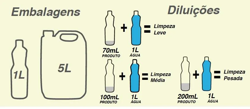 Quando o piso estiver altamente encardido, deve-se molhar a pedra antes de aplicar o produto e remover o excesso de água. Use 1 parte de produto para 5 partes de água para sujidade PESADA e deixe que o produto atue no mínimo 5 minutos. Após esfregue e enxágüe. Para sujidade MÉDIA pode-se diluir 1 parte de produtos para 10 partes de água. Para sujidade LEVE diluir 1 parte de produtos para 15 partes de água, procedendo como acima indicado.